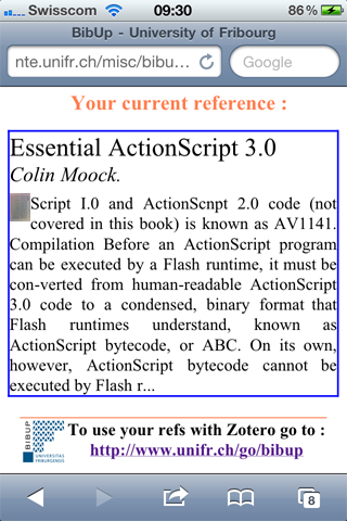 Grâce à BibUp l’accès aux références se fait très simplement et automatiquement au moyen d’un iPhone. Une fois les références stockées dans Zotero (module complémentaire de Firefox), elles peuvent être très facilement insérées dans un logiciel de traitement de texte.