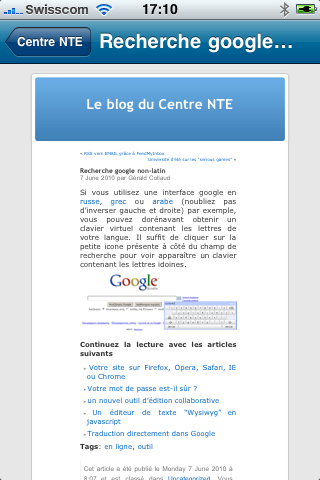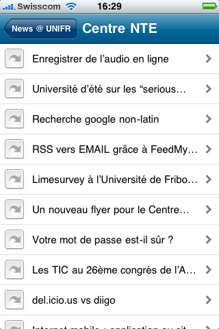 Cette application, appelée News@UNIFR, sera disponible sur l’Apple Store, comme toutes les applications iPhone d’ailleurs, dès qu’elle sera validée par Apple (nous publierons un billet sur le blog du Centre dès que ce sera le cas).