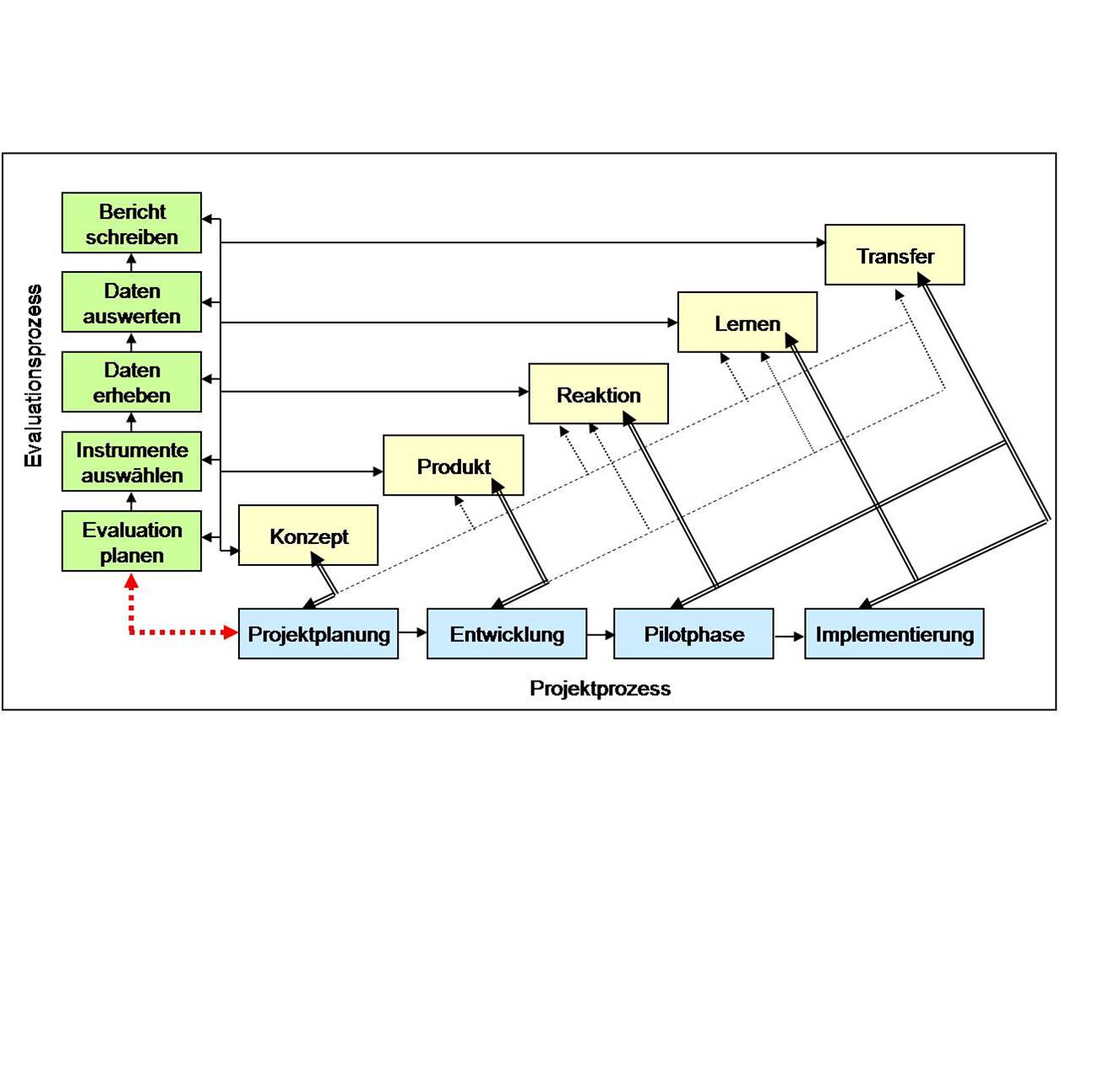 - Evaluationsprozess - Evaluationsebenen (einfache Pfeile): Die Phasen der Evaluation werden immer durchlaufen, egal auf welche Ebene(n) sich die Evaluation bezieht und wann im Projektverlauf sie durchgeführt wird. Auch hier zeigen die Pfeile in beide Richtungen: Ergebnisse eines Evaluationsschrittes können wiederum in den Evaluationsprozess einfliessen.