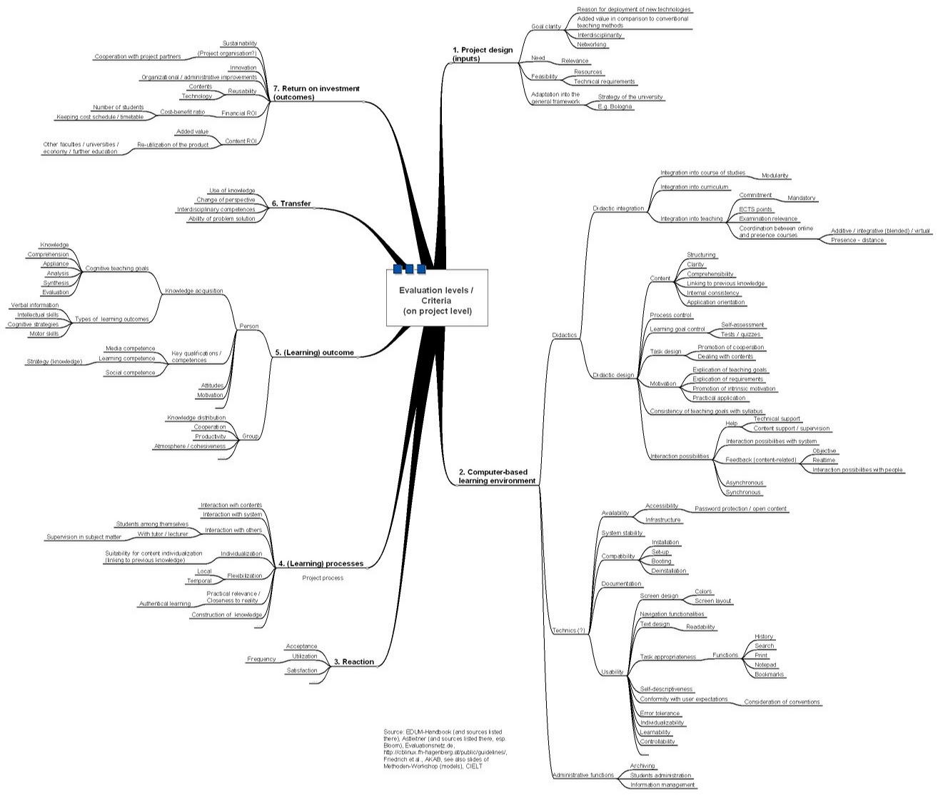 Thinking on different levels of evaluation helps you focus the question that the evaluation is to answer (following and expanded from Grote & Windlinger, 2003; evaluationsnetz, 2005; Schenkel, 2000). These levels contain generic assessment dimensions that are relevant to many e-learning projects. In this handbook, a distinction is made between the following levels: