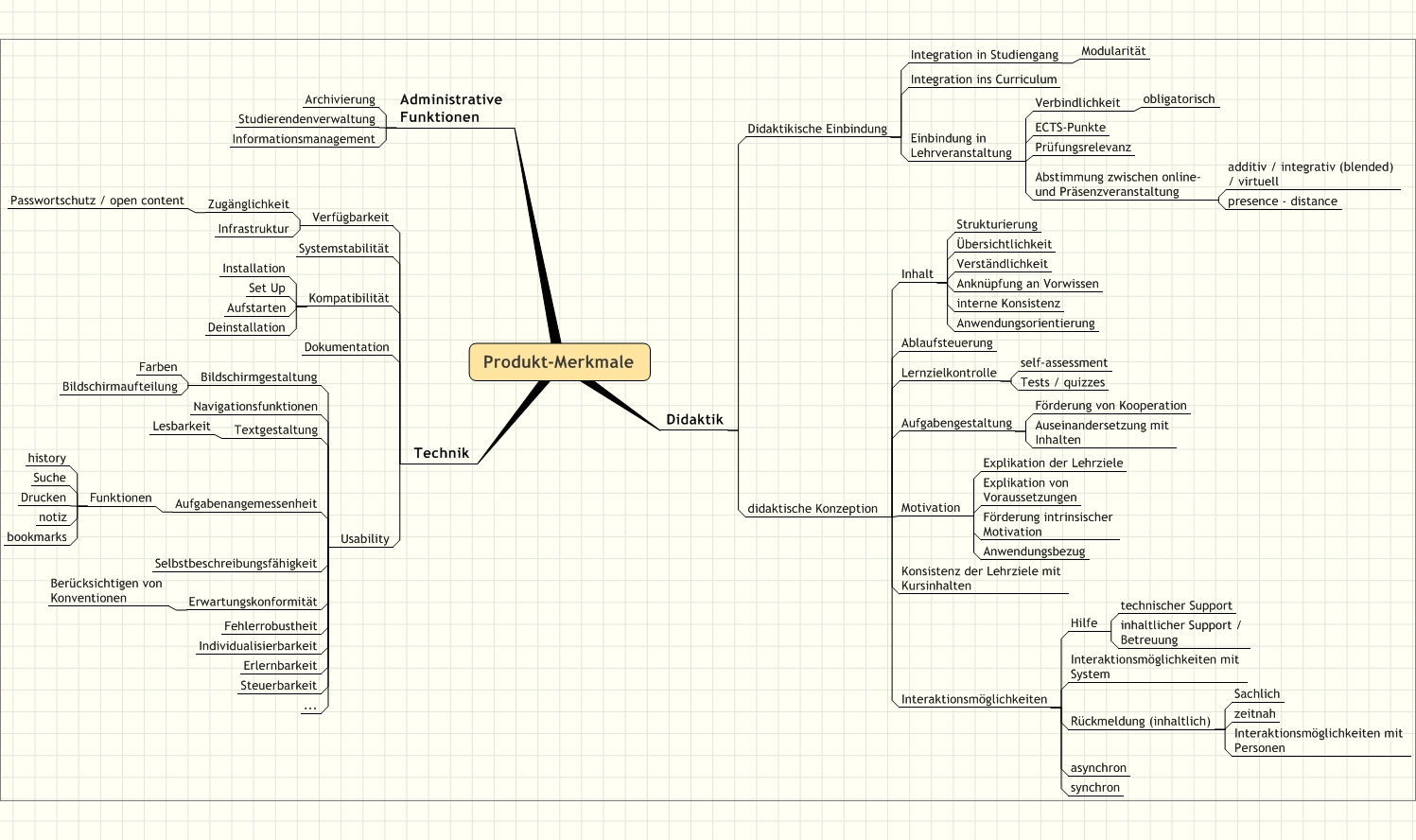 Eine Sammlung von Produkt-Merkmalen (Mindmap), die als Anregung für die Formulierung Ihrer Evaluations-Fragestellung dienen kann (wobei im Handbuch nicht alle Merkmale durch Instrumente abgedeckt sind!) finden Sie hier: Mindmap (jpg, 600 kB).